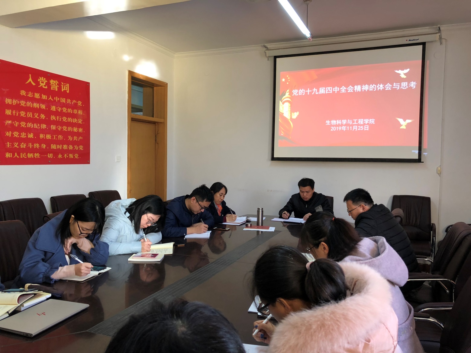 按照公司党委要求,2019年11月25日上午,生物科学与工程公司党委书记曹一伟做了题为《学习党的十九届四中全会的体会思考》的报告,全体行政人员、党支部书记、教师代表参加。