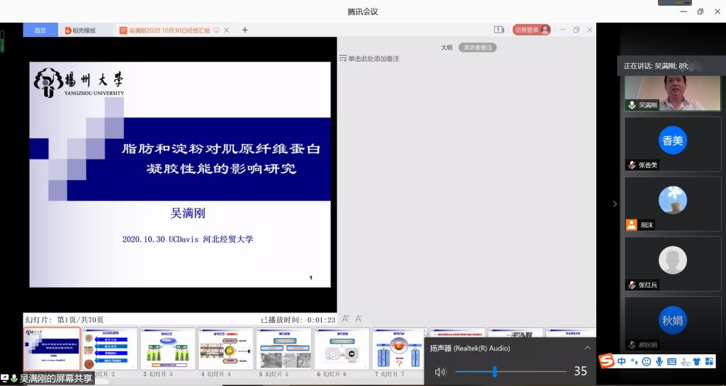 10月30日,正在美国加州大学戴维斯分校访学的扬州大学硕士生导师吴满刚副教授应bevitor伟德国际1946邀请,于线上通过腾讯会议平台作了题为“脂肪和淀粉对肌原纤维蛋白凝胶性能的影响研究”的学术报告。报告由bevitor伟德国际1946副经理张香美主持,公司百余名师生参加了此次报告会。