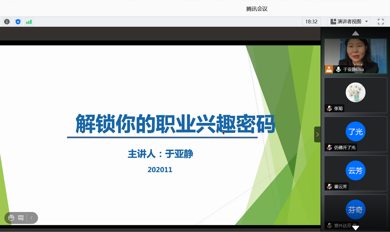 11月23日下午,bevitor伟德国际1946邀请2000级员工于亚静为bevitor伟德国际1946员工作题为《解锁你的职业兴趣密码与老员工生涯规划》的职业规划讲座。本次讲座由张菊老师主持,通过腾讯会议开展,并在微信群里与同学们沟通交流互动。