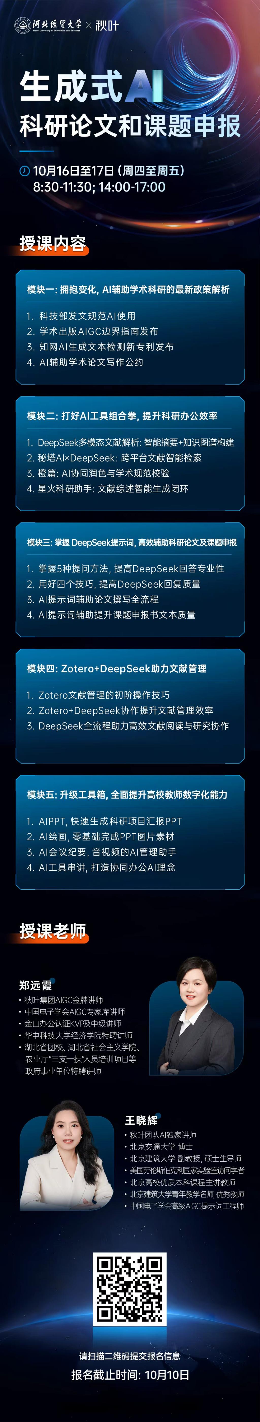 请参加培训的导师,于10月10日17:00前,扫描海报下方报名二维码,填写所在公司、姓名、工号、联系电话等信息提交报名;报名时需选择参与此次培训方式:“线下(可实操)”或“线上”,一经选择原则上不更改。若线下培训场地名额已满,将优先协调线上参与名额,并通过电话告知。